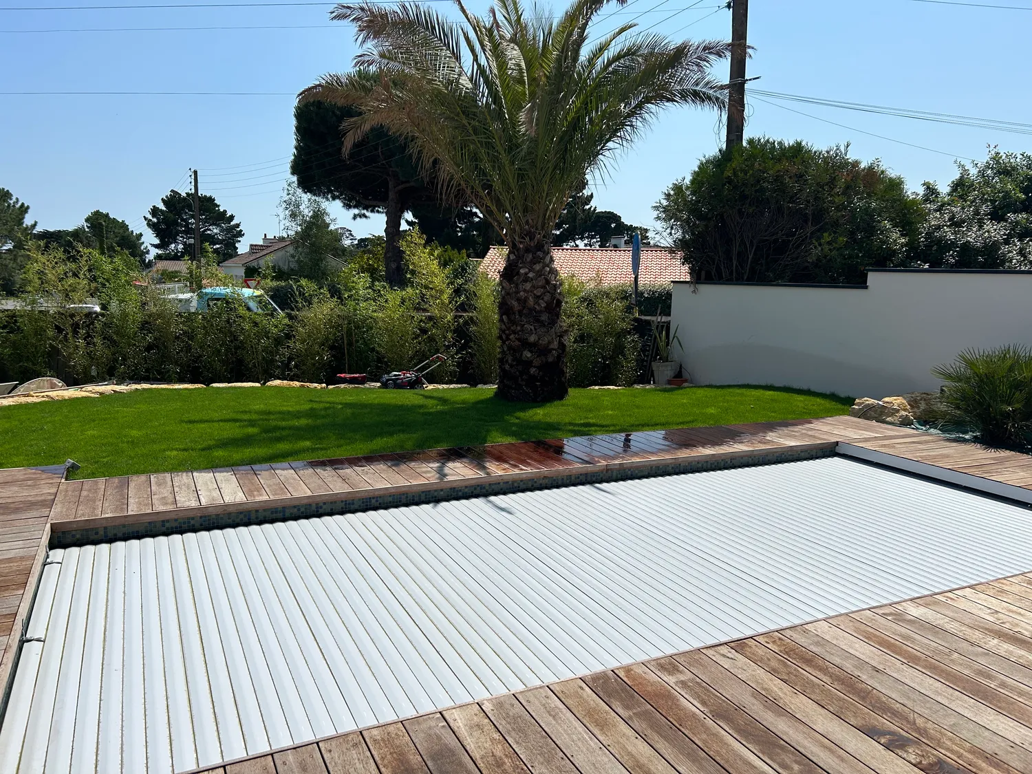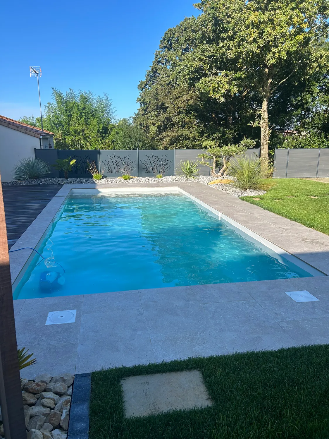 Nous installons des piscines coque polyester issues du fabricant Aboral, livrées monobloc et posées sur un radier stabilisé.